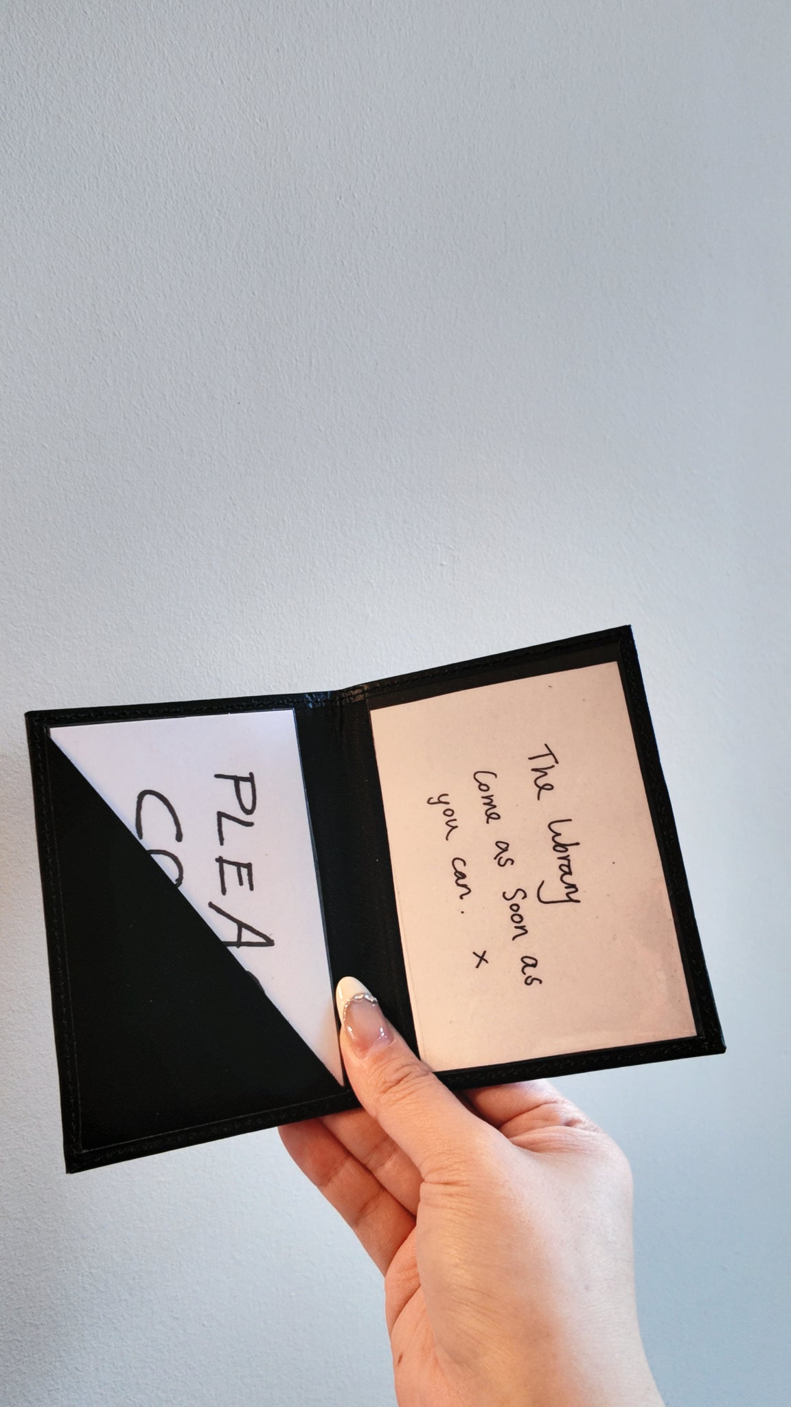 THE PROP ITSELF: The original prop was a modified driving licence holder made from black top-grain leather with an imprinted stamp. It underwent several modifications, including cutting down the interior leather edges and reshaping the inside flap to disguise its origins.